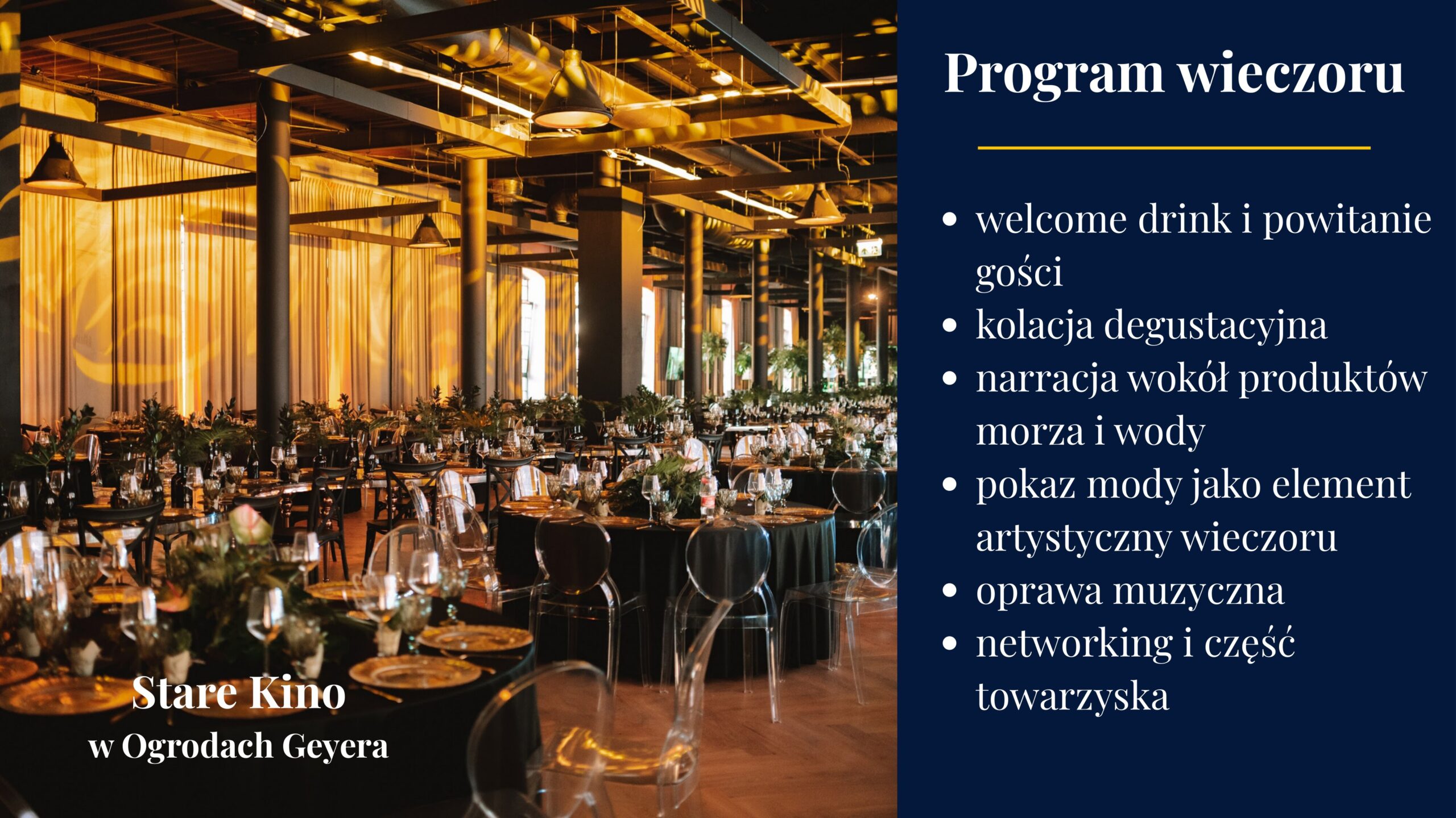 Welcome drink, kolacja degustacyjna, narracja wokół produktów morza, pokaz mody "Moda na Francuskiej Riwierze", oprawa muzyczna oraz networking w elitarnym gronie.